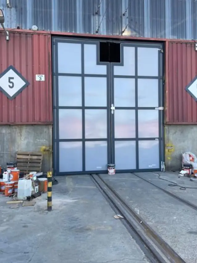 Proyecto desarrollado en la Comunidad de Madrid consistente en la instalación de 6 puertas abatibles especiales para catenaria ferroviaria, con dimensiones unitarias de 5.000 x 5.500 mm, destinadas al cierre de naves vinculadas a mantenimiento e infraestructura ferroviaria.